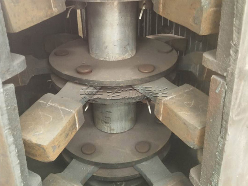 立式破碎機(jī)主要工作原理是:利用電機(jī)帶動(dòng)皮帶輪,隨著皮帶輪轉(zhuǎn)動(dòng)的另一頭,帶動(dòng)破碎機(jī)內(nèi)部轉(zhuǎn)動(dòng)主軸,主軸轉(zhuǎn)動(dòng)的同時(shí)帶動(dòng)附著主軸上的每層轉(zhuǎn)盤,轉(zhuǎn)盤再帶動(dòng)錘頭形成的高速旋轉(zhuǎn),從而將進(jìn)料口進(jìn)去的原材料利用高速旋轉(zhuǎn)、以及錘頭利用石打石的原理,將大型的石塊、鵝卵石、煤塊、炭塊等原材料進(jìn)行粉碎;